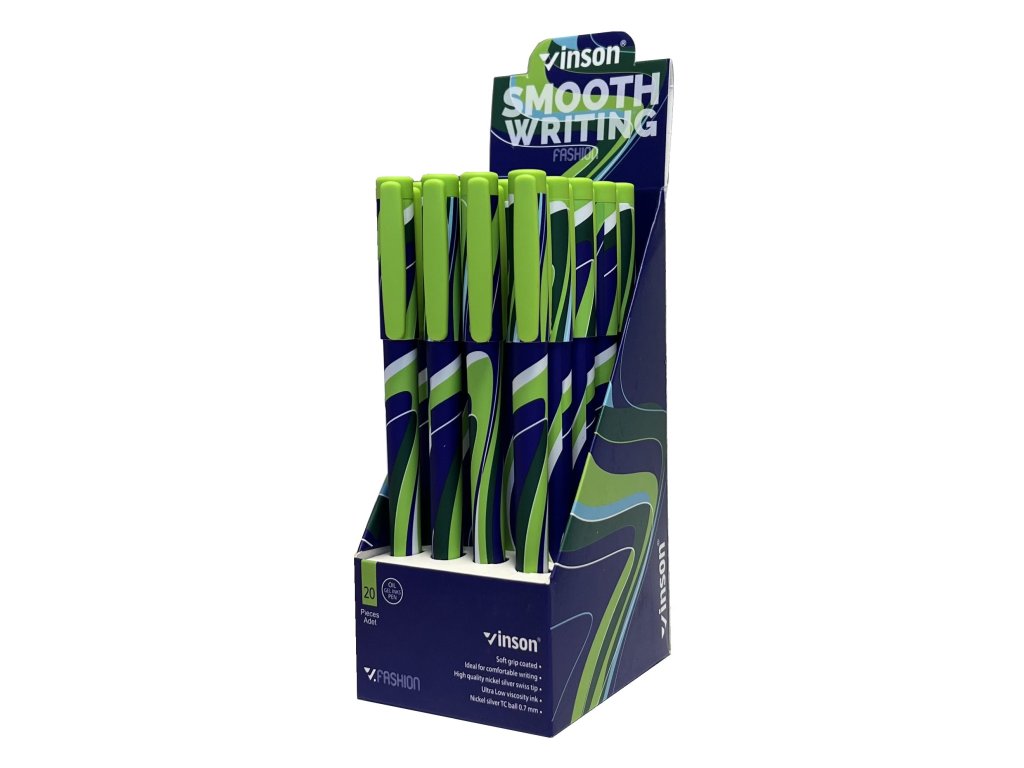 (BAL.:20ks)Keramické pero Vinson Fashion. Píše modře. Design: fashion. Provedení plast. Lehké, píše hladce, velmi příjemný úchop. Barva: zelená. Nevhodné pro děti do 3 let. Balení: Baleno po 25 ks v display boxu.Cena za 1ks.Doplňkové parametry