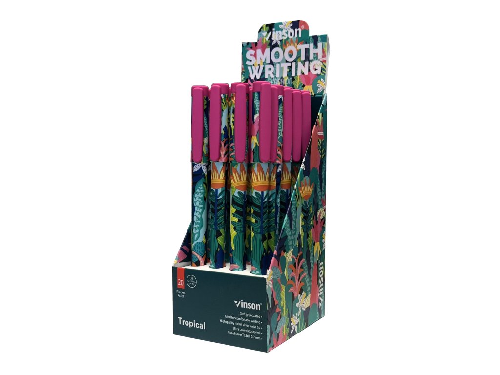 (BAL.:20ks)Keramické pero Vinson Fashion. Píše modře. Design: tropická příroda. Provedení plast. Lehké, píše hladce, velmi příjemný úchop. Barva: růžová. Nevhodné pro děti do 3 let. Balení: Baleno po 25 ks v display boxu.Cena za 1ks.Doplňkové parametry