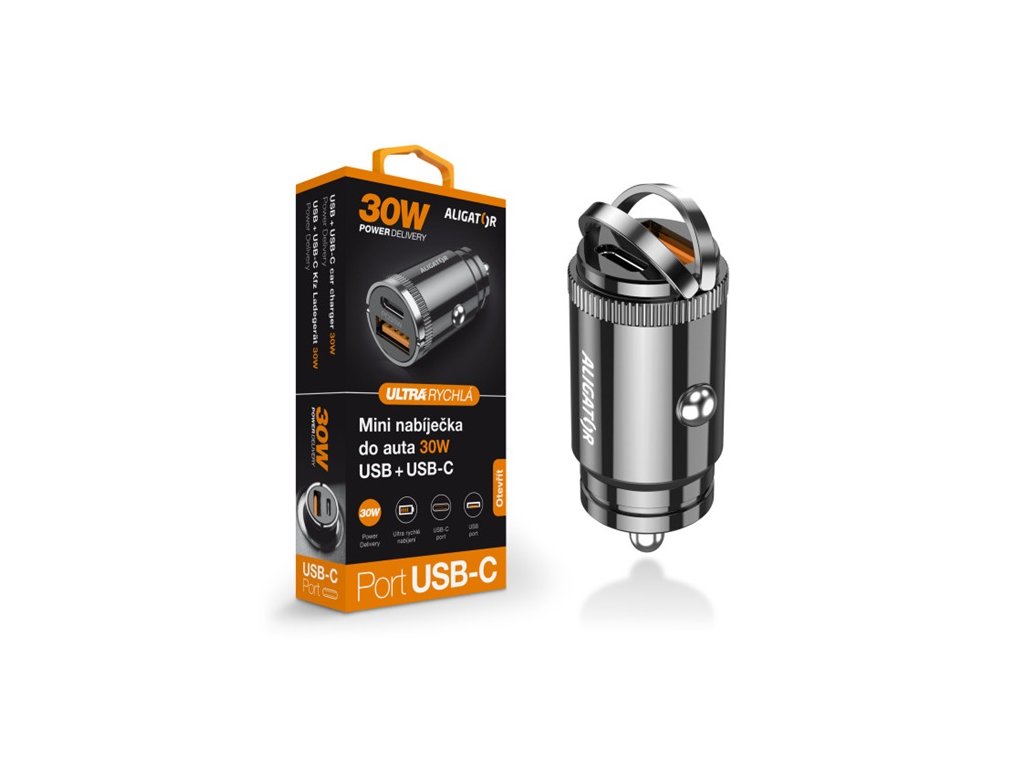 Chytrá Mini nabíječka do auta ALIGATOR Power Delivery 30W, USB-C + USB-A Technické parametry:• Vstup: DC 12-24V• Výstup: USB-C + USB-A: DC 5V – 3A• Power Delivery 30W• Ochrana proti zkratu a přetíženíDoplňkové parametry
