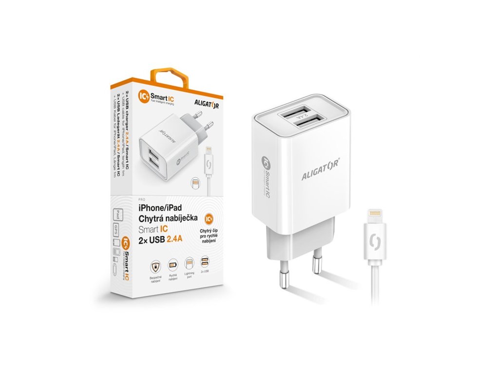 Chytrá síťová nabíječka ALIGATOR 2.4A, 2xUSB, smart IC, bílá, kabel pro iPhone/iPad 2A. Tato nabíječka je ideální pomocníkem pro dobíjení mobilního telefonu a jiných zařízení. Chytrá nabíječka zvládne doplnit energii až dvěma přístrojům najednou, navíc je vybavena chytrým čipem pro rychlé nabíjení.Doplňkové parametry