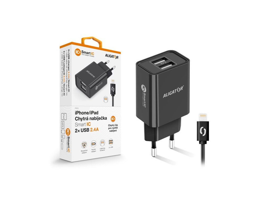 Chytrá síťová nabíječka ALIGATOR 2.4A, 2xUSB, smart IC, černá, kabel pro iPhone/iPad 2A. Tato nabíječka je ideální pomocníkem pro dobíjení mobilního telefonu a jiných zařízení. Chytrá nabíječka zvládne doplnit energii až dvěma přístrojům najednou, dále je vybavena chytrým čipem pro rychlé nabíjení.Doplňkové parametry