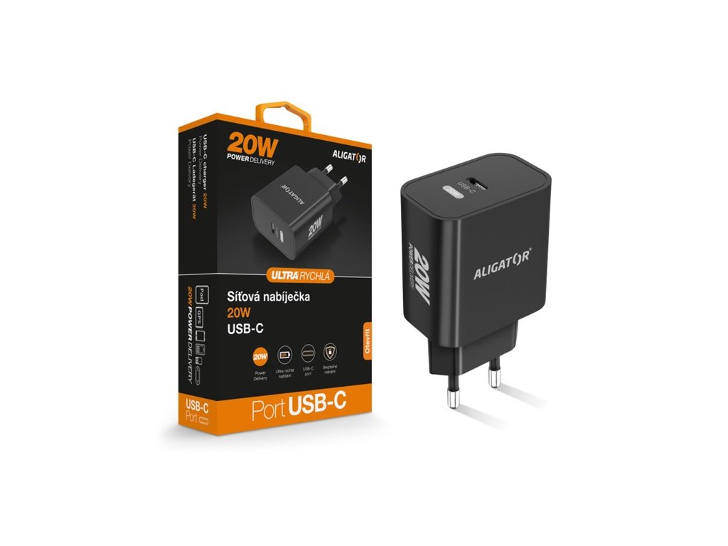 Chytrá síťová nabíječka ALIGATOR Power Delivery 20W, USB-C Technické parametry: ? Vstup: AC 100-240V ? Výstup: DC 5V-3A, 9V-2.22A, 12V-1.67A ? Power Delivery 20W ? Ochrana proti zkratu a přetížení ? Barva: černáDoplňkové parametry