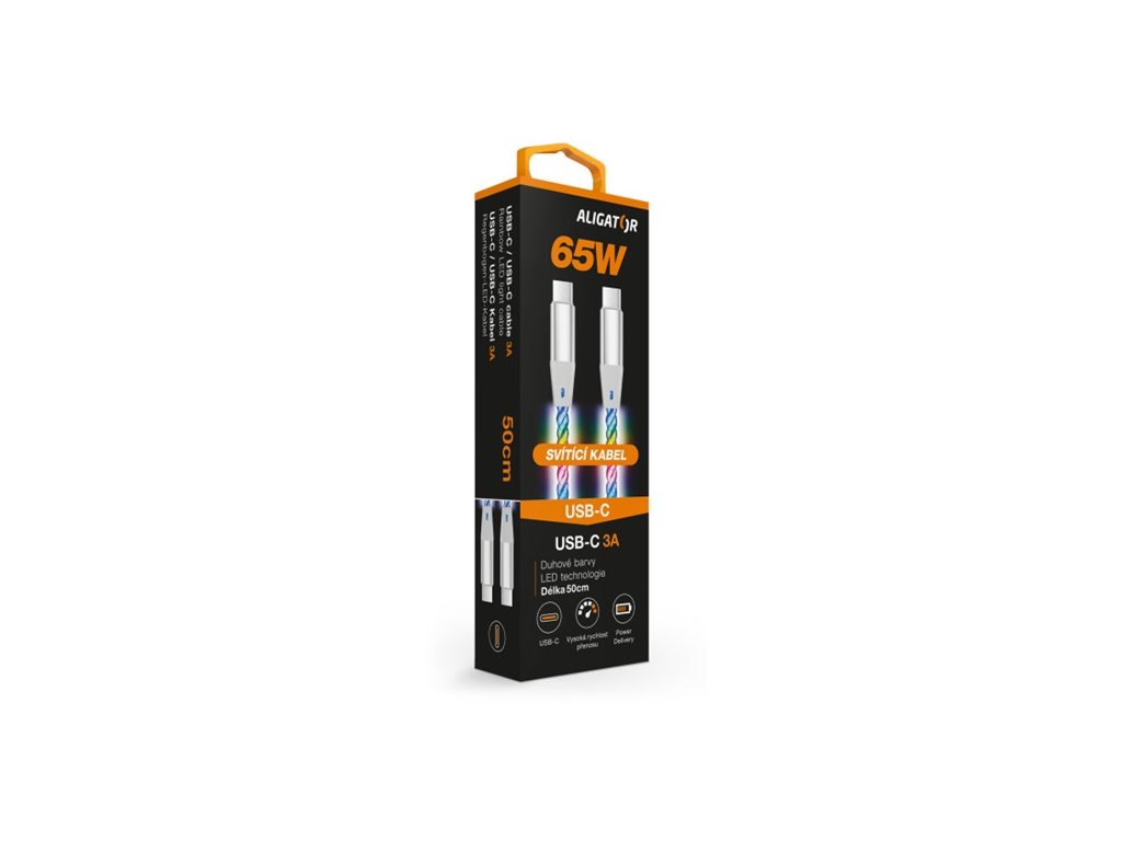 Datový a nabíjecí USB-C /Lightning kabel: LED technologie; Kabel po připojení ihned svítí a mění barvy; Duhové barvy RGB; Ultra rychlé nabíjení: 3A; Power Delivery až 30W; Kompatibilní s iPhone/iPad s konektorem Lightning; Vysoká rychlost přenosu dat; Precizní zpracování měděného opletení; Délka: 50cmDoplňkové parametry