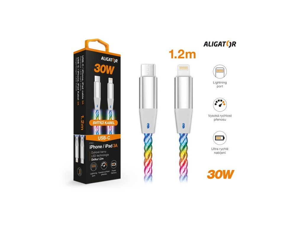 Datový a nabíjecí USB-C /USB-C kabel: LED technologie; Kabel po připojení ihned svítí a mění barvy; Duhové barvy RGB; Ultra rychlé nabíjení: 3A; Power Delivery až 65W; Vysoká rychlost přenosu dat; Vysoce kvalitní kovové konektory; Precizní zpracování měděného opletení; Flexibilní a odolný; Délka: 50cmDoplňkové parametry