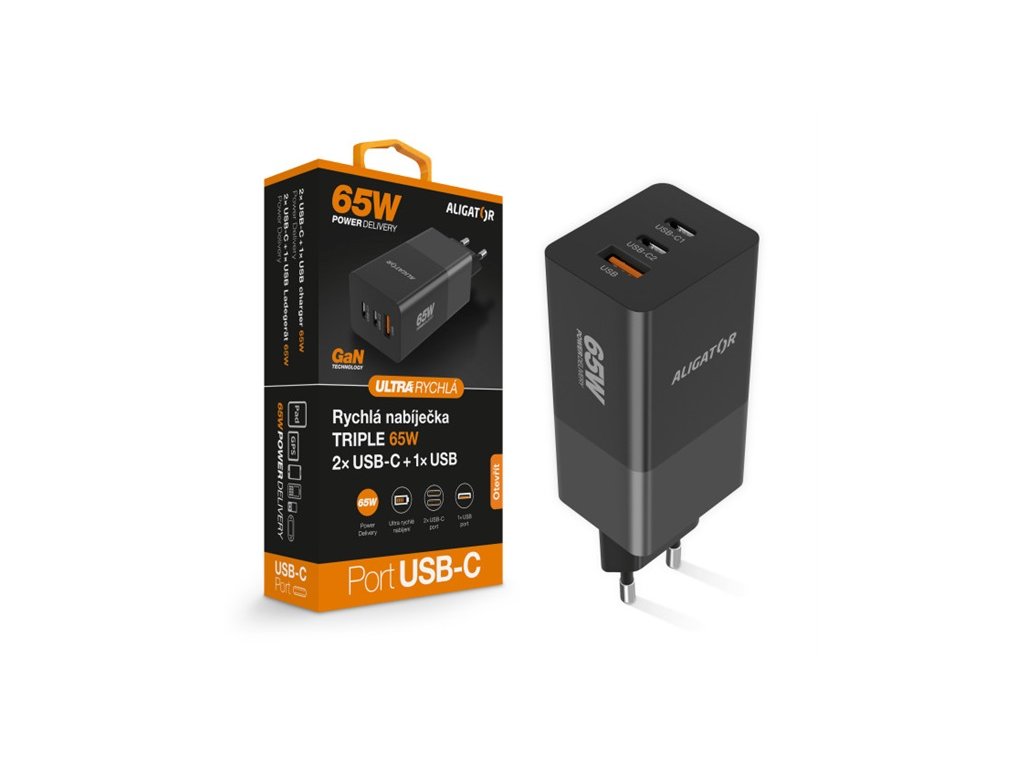 Chytrá GaN síťová nabíječka ALIGATOR Power Delivery 65W, 2xUSB-C + USB - Výkonná a SMART; Rychlá GaN síťová nabíječka 2xUSB-C + USB ALIGATOR Power Delivery 65W; Výkonná síťová nabíječka řady „POWER DELIVERY“ v moderním bílém provedení s USB-A portem a dvěma ultra rychlými USB-C porty o výkonu 65W.Doplňkové parametry