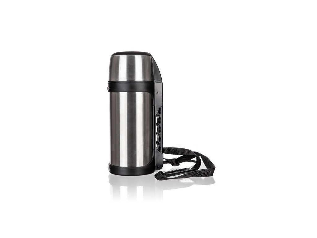 Termoska cest. PENTA 1,5l ner.; Nerezová cestovní termoska PENTA o objemu 1,5 l, má dvouplášťové provedení, vnější i vnitřní povrch je vyroben z nerezi 201. Má plastový uzávěr a ve víčku termosky je vložen pohárek na pití. Součástí termosky je plastové držadlo a popruh pro pohodlné nošení. Nerezové termosky jsou velmi odolné a bezpečné, nehrozí rozbití vložky či opaření při manipulaci. Teplotní pokles je závislý na teplotě nápoje při plnění, množství nápoje a teplotě okolí.