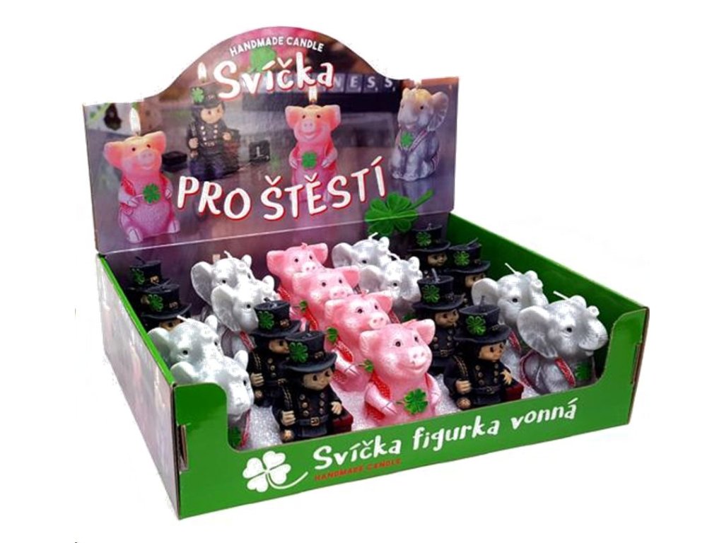 (BAL:20ks) Svíčka pro štěstí, vůně pivoňka - figurka parfémovaná. Ruční práce.Figurka - slůně, kominíček, prasátko,Výška 75mm, Rozměr boxu: 29x9x22cm,Doba hoření: 3 až 5 hodin,Prodej po 20ks v boxu.Cena za jeden kus.Doplňkové parametry