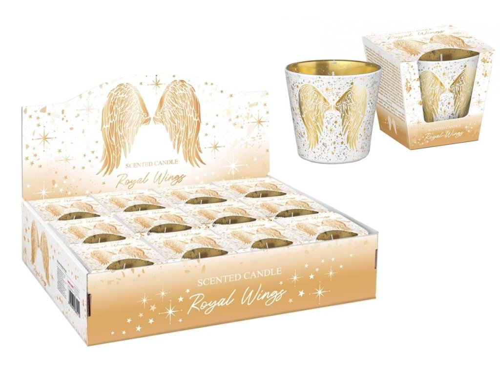 (BAL:12ks) Svíčka s vůní v kónickém skle, královská křídla.Vůně: nebeská vůně. Rozměr: průměr 9 x 8,5cm. Rozměr boxu: 39 x 28,5 x 9cm. Doba hoření: 30 hodin. Prodej po 12ks v boxu.Cena za jeden kus.Doplňkové parametry