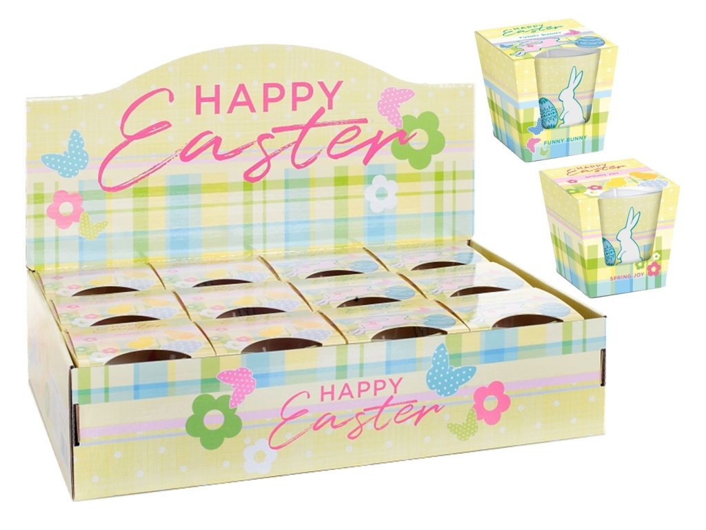 (BAL:12ks) Svíčka v kónickém skle, veselé Velikonoce.Dekor: jarní radost, veselý zajíček.Vůně: velikonoční.Rozměr: průměr 9 x 8,5cm, Rozměr boxu: 40 x 30 x 10cm Doba hoření: 30 hodinProdej po 12ks v boxu.Cena za jeden kus.Doplňkové parametry