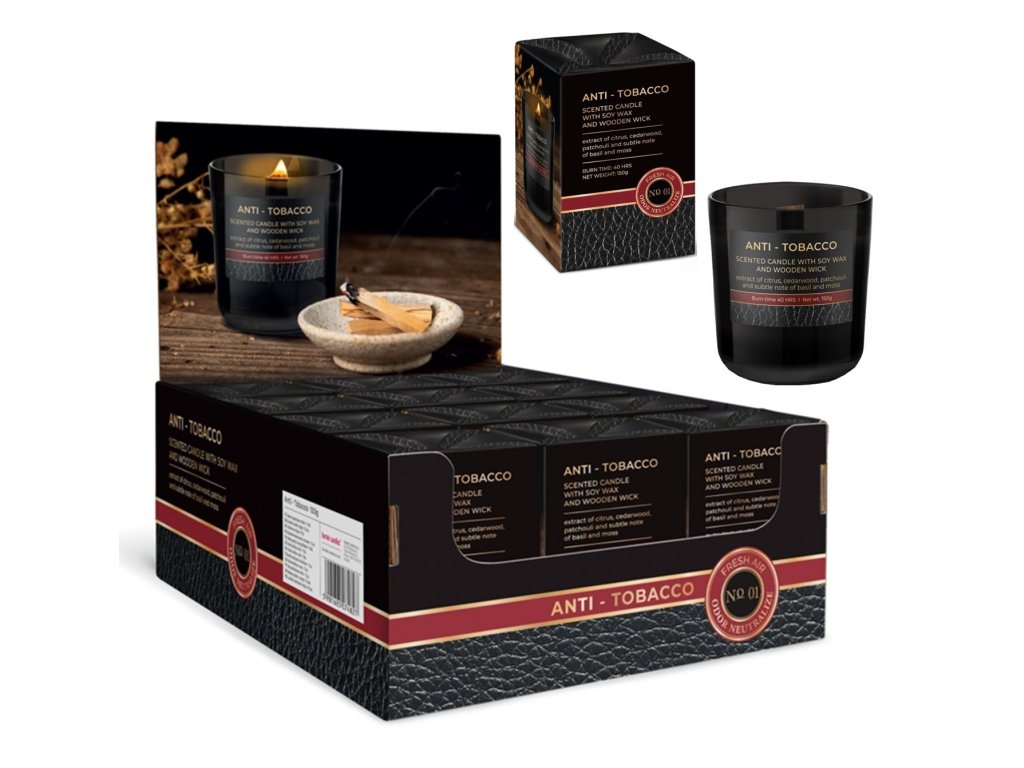 (BAL:12ks) Svíčka s vůní v kónickém skle, dekor anti tabák. Neutralizuje tabákový kouř.Provedení: se sójovým voskem a dřevěným knotem. Baleno v luxusní dárkové krabičce. Vůně: anti tabák - extrakt z citrusů, cedrového dřeva a pačuli. Rozměr: 8 x 8,5cm. Rozměr boxu: 26 x 34 x 12cm.Doba hoření: 40 hodin. Prodej po 12ks v boxu. Cena za jeden kus.Doplňkové parametry