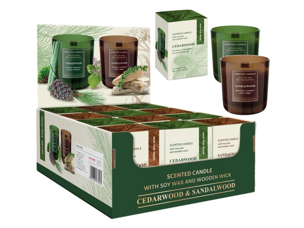 (BAL:12ks) Svíčka s vůní v kónickém skle, dřevo se sójovým voskem. Baleno v luxusní dárkové krabičce.Vůně: cedrové dřevo, santalové řevo. Provedení: se sójovým voskem a dřevěným knotem.Rozměr: 8 x 8,5cm.Rozměr boxu: 26 x 34 x 12cm .Doba hoření: 40 hodin.Prodej po 12ks v boxu.Cena za jeden kus.Doplňkové parametry