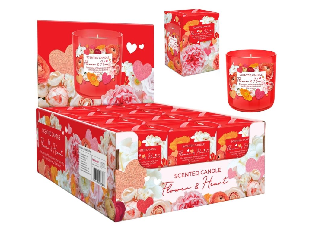 (BAL:12ks) Svíčka s vůní v kónickém skle, květina a srdce. Motiv: květina a srdce.Baleno v luxusní dárkové krabičce.Vůně: jemná květinová. Rozměr: 8 x 8,5cm.Rozměr boxu: 26 x 34 x 12cm .Doba hoření: 30 hodin.Prodej po 12ks v boxu.Cena za jeden kus.Doplňkové parametry