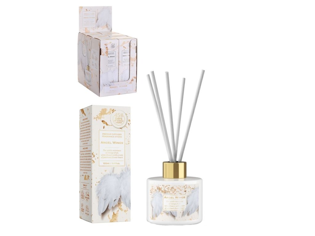 (BAL:6ks) Vánoční aroma difuzér s tyčinkami 100ml andělská křídla. Provedení: hůlky a nádobka s tekutinou na bázi vody. Vůně: andělská vůně. Design: Angel wings. Baleno v dárkové krabičce. 45 dní intenzivního aroma.Rozměr: 7 x 21cm. Rozměr boxu: 15,5 x 22 x 20,5cm. Prodej po 6ks v boxu. Cena za jeden kus.Doplňkové parametry
