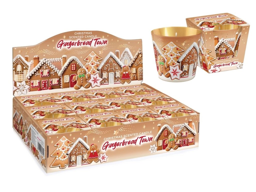 (BAL:12ks) Vánoční svíčka v kónickém skle, perníkové město.Vánoční dekor s vůní: perníčků. Rozměr: průměr 9 x 8,5cm, Rozměr boxu: 40 x 30 x 10cm,Doba hoření: 30 hodinProdej po 12ks v boxu.Cena za jeden kus.Doplňkové parametry