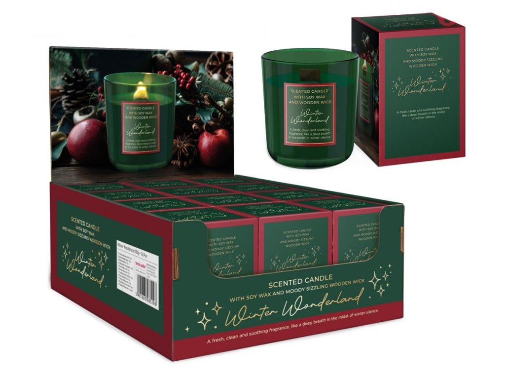(BAL:12ks) Vánoční svíčka s vůní v kónickém skle, zimní říše divů. Provedení: se sójovým voskem a dřevěným knotem. Vůně: Svěží, čistá a uklidňující vůně, jako hlubina uprostřed zimního ticha. Baleno v luxusní dárkové krabičce. Dekor: luxusní.Rozměr: 8 x 9cm. Rozměr boxu: 26 x 34 x 12cm.Doba hoření: 35 hodin. Prodej po 12ks v boxu. Cena za jeden kus.Doplňkové parametry