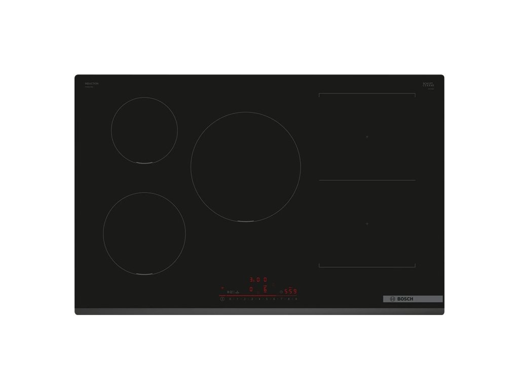 indukční varná deska, 80 cm, 5 indukčních varných zón, z toho 1 CombiZone, ovládání DirectSelect+, PowerBoost, Smart Hood Automatic, HoodControl, funkce Assist, dětská pojistka, 2stupňový ukazatel zbytkového tepla pro každou varnou zónu, příkon: 7,4 kW, přední fazeta