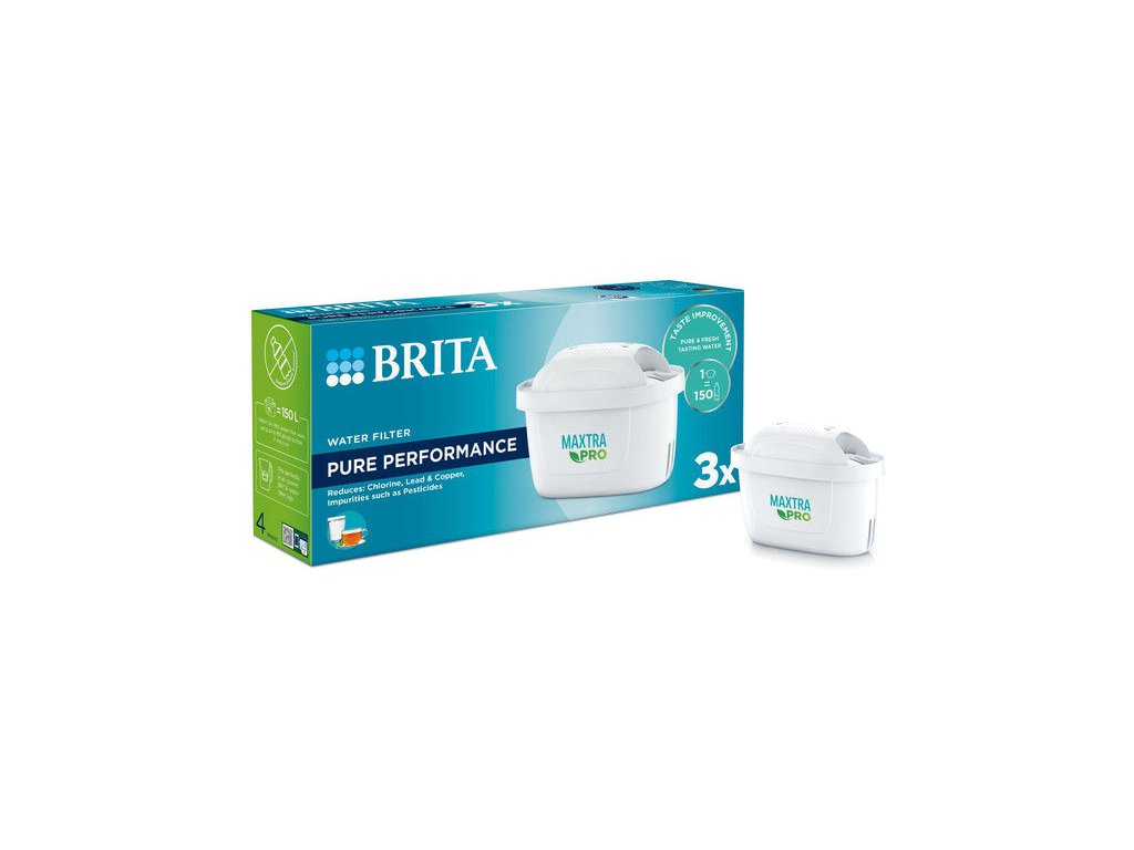 Vodní filtr Brita Maxtra Pro Pure Performance, 3 ks. Čistší, chutnější a svěží voda. Jeden filtr je určený na přefiltrování až 150 litrů vody, nebo až na 4 týdny používání.Doplňkové parametry