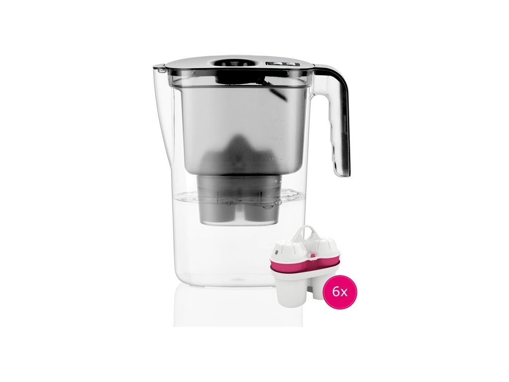 legantní černá filtrační konvice BWT VIDA o objemu 2.6 litru s mechanickým ukazatelem výměny filtru. Balení obsahuje 6x filtr, který obohacuje vodu o ionty zdraví prospěšný hořčíkDoplňkové parametry