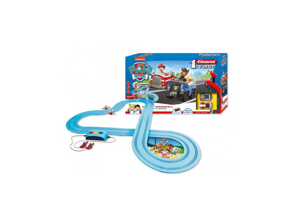 Autodráha Carrera FIRST dlouhá 3,5m s auty ze seriálu Tlapková patrola, pro děti od 3 let, na baterie, obsahuje napájecí díl s interaktivními hrami, zvuky a světly, rovinky, zatáčky, vrtule pro větší zábavu při jízdě, ovladače a dekorace s tématikou Tlapková patrola.Doplňkové parametry