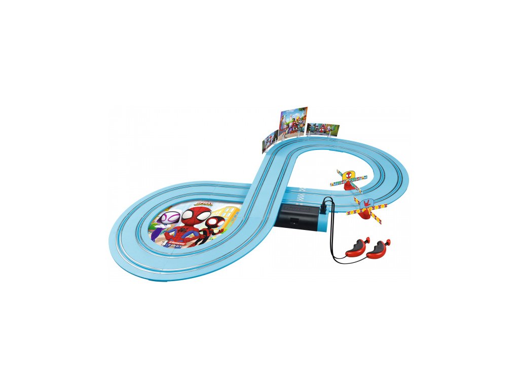 Autodráha Carrera FIRST dlouhá 2,4m s auty Spidey a Spin, pro děti od 3 let, na baterie, obsahuje rovinky, zatáčky, vrtule pro větší zábavu při jízdě, ovladače a dekorace s tématikou Spiderman.Doplňkové parametry