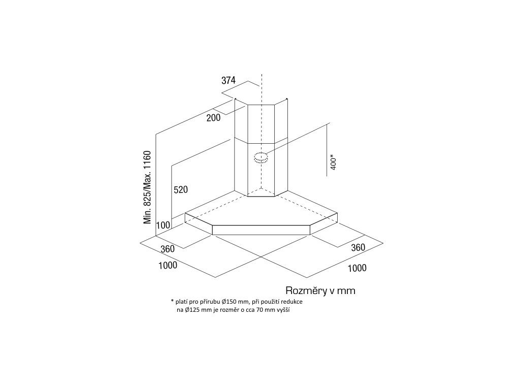 Komínová do rohu, 1000 mm, nerez, ovládání VL3 s modře prosvětlenými tlačítky, 1 motor BT3 280 W, 3 rychlosti, 850 m3/h (5 Pa), max. hlučnost Lw 67 dB, max. tlak 450 Pa, 15 min. časovač, LED světla 2 × 4 W.