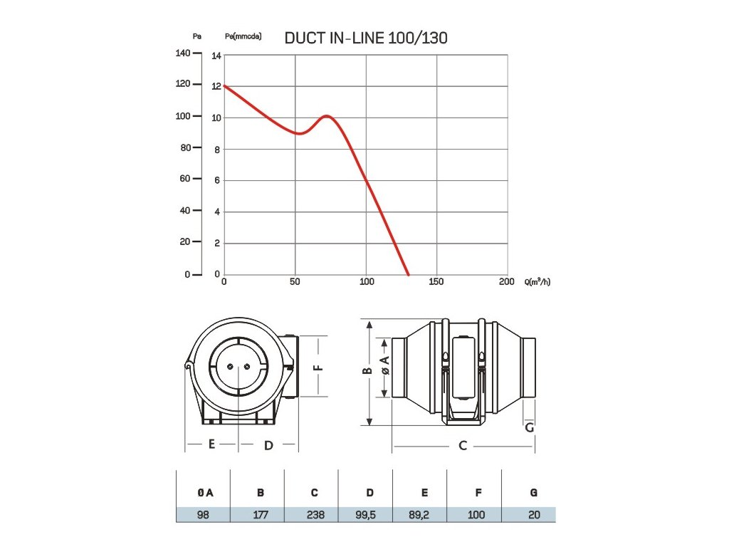 Potrubní ventilátor radiální, pr. 100 mm, 130 m³/h, 14 dB(A), 14 mmH2O (137 Pa), IPX4 Pro odtah až 12 m ZDARMA držák pro montáž na zeď nebo strop Odnímatelné příruby pro snazší montážDoplňkové parametry