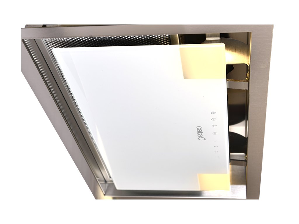 Neviditelná vestavná digestoř, 450 mm (pro 600 mm skříňku), nerez / bílé sklo, přehledné a snadno přístupné dotykové (sensorové) ovládání na výklopném spodním panelu, 3 rychlosti, max. výkon 710 m³/h (5 Pa), hlučnost Lw 40 – 67 dB(A), max. tlak 450 Pa, 15 min. časovač, kovové sendvičové tukové filtry, které lze mýt v myčce, výstupní průměr 150 mm, možnost práce v odtahovém i recirkulačním režimu, snadná montáž, Výbava: úsporné LED osvětlení 2 × 4 W s nastavitelnou intenzitou jasu. Recirkulační režim u vestavných digestoří: Digestoř se osadí uhlíkovým pachovým filtrem. Přefiltrovaný vzduch se z digestoře odvádí obdobně jako u odtahového režimu trubkou, která prochází celou skříňkou. Tato trubka však neústí kolenem do zdi, ale nad skříňku, kde ji doporučujeme zakončit mřížkou. Pro výrobu skříňky je směrodatný rozměrový nákres a údaje v něm uvedené. Fotografie digestoří jsou ilustrační.Doplňkové parametry