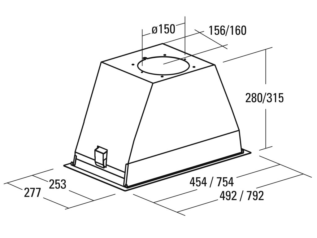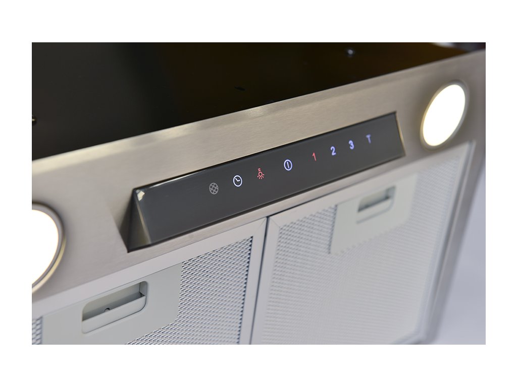 Vestavná, 450 mm (do 600 mm skříňky), nerez, 1 motor BT3 280 W, 3 rychlosti, 820 m³/h (5 Pa), max. tlak 405 Pa, max. hlučnost Lw 67 dB, 15 min. časovač, LED světla s nastavitelnou intenzitou jasu. Recirkulační režim u vestavných digestoří: Digestoř se osadí uhlíkovým pachovým filtrem. Přefiltrovaný vzduch se z digestoře odvádí obdobně jako u odtahového režimu trubkou, která prochází celou skříňkou. Tato trubka však neústí kolenem do zdi, ale nad skříňku, kde ji doporučujeme zakončit mřížkou. Pro výrobu skříňky je směrodatný rozměrový nákres a údaje v něm uvedené. Fotografie digestoří jsou ilustrační.Doplňkové parametry