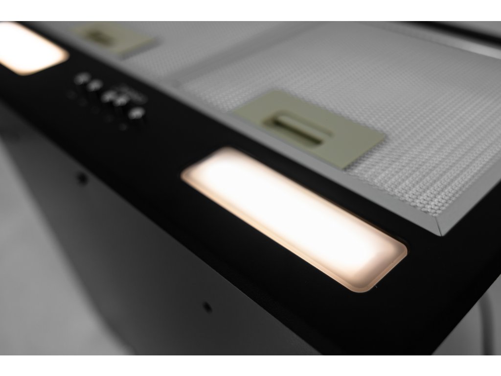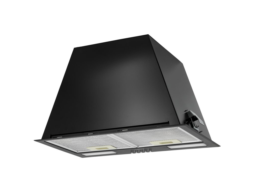 Vestavná, 450 mm (do 600 mm skříňky), černá, 1 motor BT2 200 W, 3 rychlosti, 600 m3/h (5 Pa), max. hlučnost Lw 65 dB(A), max. tlak 405 Pa. Recirkulační režim u vestavných digestoří: Digestoř se osadí uhlíkovým pachovým filtrem. Přefiltrovaný vzduch se z digestoře odvádí obdobně jako u odtahového režimu trubkou, která prochází celou skříňkou. Tato trubka však neústí kolenem do zdi, ale nad skříňku, kde ji doporučujeme zakončit mřížkou. Pro výrobu skříňky je směrodatný rozměrový nákres a údaje v něm uvedené. Fotografie digestoří jsou ilustrační.Doplňkové parametry