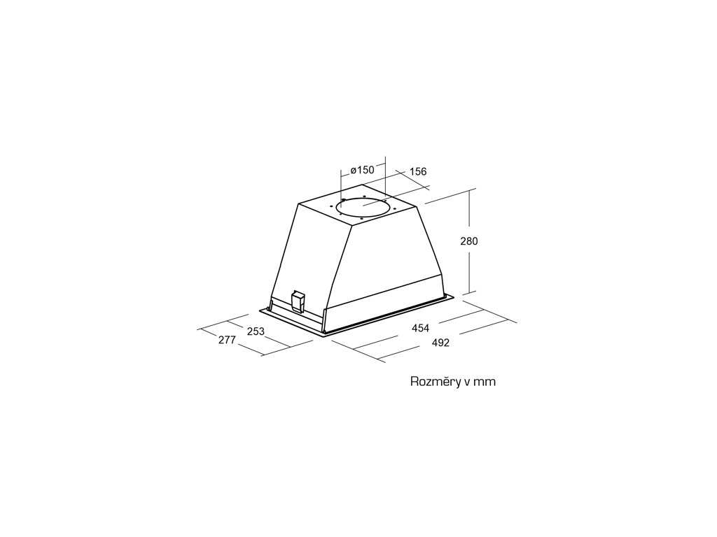 Vestavná, 450 mm (do 600 mm skříňky), nerez, 1 motor BT2 200 W, 3 rychlosti, 600 m3/h (5 Pa), max. hlučnost Lw 65 dB(A), max. tlak 405 Pa.