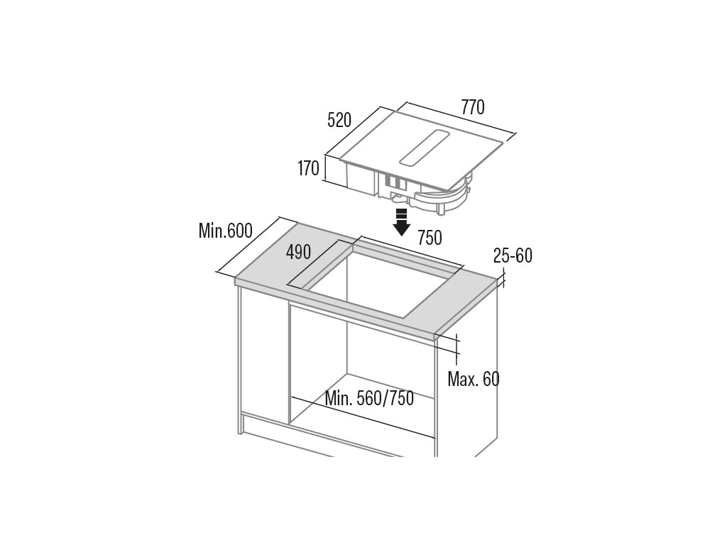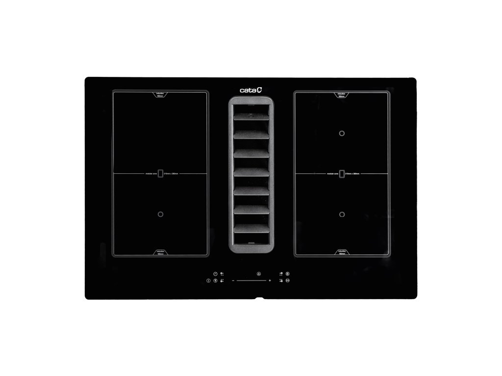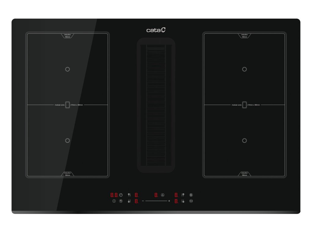 CATA IAS 7024 je špičková elektrická indukční varná deska s vestavěným odsavačem par, která kombinuje elegantní design s inovativními technologiemi pro moderní kuchyni. Klíčové vlastnosti: - Extrémně nízká – jen 17 cm (technologie FLOW-IN): Pod varnou deskou mohou být umístěné běžné kuchyňské zásuvky pro nádobí. - Intuitivní ovládání: Deska je vybavena senzorovým (dotykovým) ovládáním Mono Slider pro snadnou a přesnou regulaci. - Vysoký výkon: Celkový výkon 7,4 kW zajišťuje rychlé a efektivní vaření. - 4 varné zóny s funkcí BOOSTER: Všechny čtyři varné zóny disponují funkcí BOOSTER (rychlého ohřevu) pro okamžité dosažení požadované teploty. - Bezpečnostní prvky: Indikátor zbytkového tepla, dětská pojistka, pojistka proti přehřátí a automatické vypnutí se zvukovým signálem po 20 sekundách nečinnosti zajišťují maximální bezpečnost. - G4 indukční technologie: Powermanagement s možností nastavení pro různé typy zapojení a hodnoty jističů. Plynulé řízení výkonu. - Modulární (FLEX) indukční zóny: Možnost propojení varných zón pro vytvoření větších varných ploch (dvě zóny 215x190 mm nebo jedna zóna 215x380 mm na každé straně desky) poskytuje flexibilitu při vaření s velkými hrnci, pánvemi nebo grilovacími deskami. - Automatické funkce: Deska disponuje automatickou detekcí hrnců a funkcemi vaření, jako je rozmrazování, udržování teploty a vaření v páře. Časovače pro každou zónu. - Integrovaný odsavač par: S maximálním průtokem vzduchu 691 m³/h, dotykovým ovládáním s 5+1 TURBO nastaveními a nízkou hlučností v rozmezí 50 až 74 dB(A). Bezkartáčový motor zajišťuje tišší provoz, vyšší účinnost, přesné elektronické řízení, delší životnost a menší produkci tepla. Automatické řízení výkonu digestoře podle nastavených stupňů na jednotlivých varných zónách s možností přepnutí na manuální volbu výkonu. - Více možností odvodu par: Při recirkulačním provozu lze páry odvést dozadu skrz zadní stěnu skříňky do volného prostoru nebo skrz zadní prostor a prostor pod skříňkami dopředu ve spodní části skříňky nebo skrz zadní prostor do volného prostoru po bocích skříňky. Případně lze výdech digestoře připojit na odtahové potrubí. - Snadná údržba: Pro recirkulační provoz možnost volby základního jednorázového uhlíkového filtru s životností až 1 rok nebo vyjímatelných a regenerovatelnýché keramických voštinových filtrů (použitelné 3-5 let při pravidelné regeneraci). Regenerovatelné keramické filtry jsou dodávané zdarma s novým výrobkem. Snadno vyjímatelné kovové tukové filtry a omyvatelná nádržka na sběr tekutin obojí s možností mytí v myčce. Indukční deska 4 varné zóny: Pravá přední – rozměr 21,5 cm x 19 cm / 2,3 kW (Booster 3 kW) Pravá zadní – rozměr 21,5 cm x 19 cm / 2,2 kW (Booster 2,6 kW) Levá přední – rozměr 21,5 cm x 19 cm / 2,3 kW (Booster 3 kW) Levá zadní – rozměr 21,5 cm x 19 cm / 2,2 kW (Booster 2,6 kW) Možnost vytvoření 2 zdvojených zón o rozměrech 21,5 cm x 38 cm / 3,7 kW Dotykové ovládání s akustickou signalizací (Mono Slider) 9 nastavitelných úrovní výkonu + BOOSTER Funkce časovače pro každou zónu Funkce minutky Automatická detekce pánve Dětská pojistka Indikátor zbytkového tepla Automatické bezpečnostní vypnutí Přední zkosení (fazeta) Šíře 77 cm Odsavač par Dotykové ovládání s akustickou signalizací s funkcí časovače5 rychlostí + TURBO Sací výkon (dle UNE/EN 61591): 232 m3/h – 498 m3/h (Turbo 691 m3/h) Hlučnost (dle Reg.(EU) 65/2014): 50 dB(A) – 69 dB(A) (Turbo 74 dB(A)) Tichý bezkartáčový (BRUSHLESS) motor. Maximální příkon motoru 165 W Doběhový časovač Indikátor zanešení filtrů Snadná instalace Tukové filtry lze mýt v myčce Energetická třída A+Doplňkové parametry