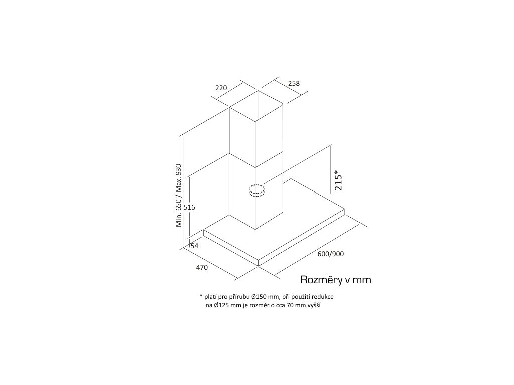Komínová ke zdi, 600 mm, nerez / černé sklo, 1 motor K7 Plus 95 W, 3 rychlosti, 400 m³/h (5 Pa), max. hlučnost Lw 62 dB, max. tlak 200 Pa, senzorové (dotykové) ovládání, halogenová světla s nastavitelnou intenzitou jasuDoplňkové parametry