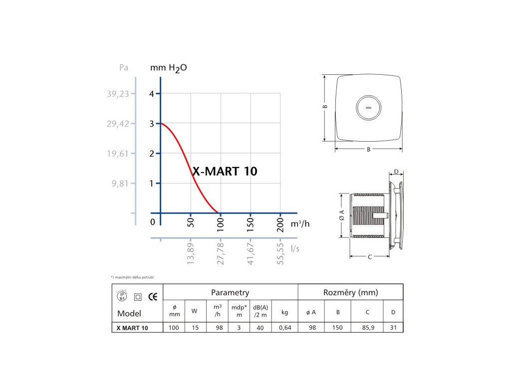 Axiální ventilátor na zeď, do stropu či do okna X-MART, supertichý, super design, snadné čištění, pr. 100 mm, 98 m³/h, 40 dB(A), 3 mmH2O (29 Pa), IPX4, doběhový časovač, nerez čelní deska!Doplňkové parametry