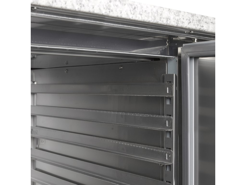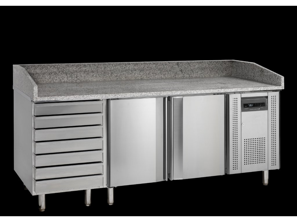 Řada PT chladicích pizza stolů je vyrobena z nerezové oceli SS304. Má žulovou desku, která je pro přípravu pizzy ideální, protože žula zůstává chladná a těsto se na ni méně lepí. Stůl je k dispozici se 2 dvířky a sadou 7 neutrálních, nechlazených zásuvek na levé straně. Také je možné pořídit si přizpůsobenou variantu se se zásuvkami 1/2 + 1/2 (kód12526). Chladicí pizza stoly mohou být dodávány buď v kompletu s chladicí nástavbou pro GN 1/3 x 150 mm (nejsou součástí) nebo samostatně bez nástavby.Doplňkové parametry