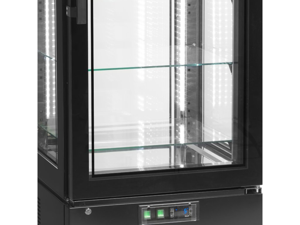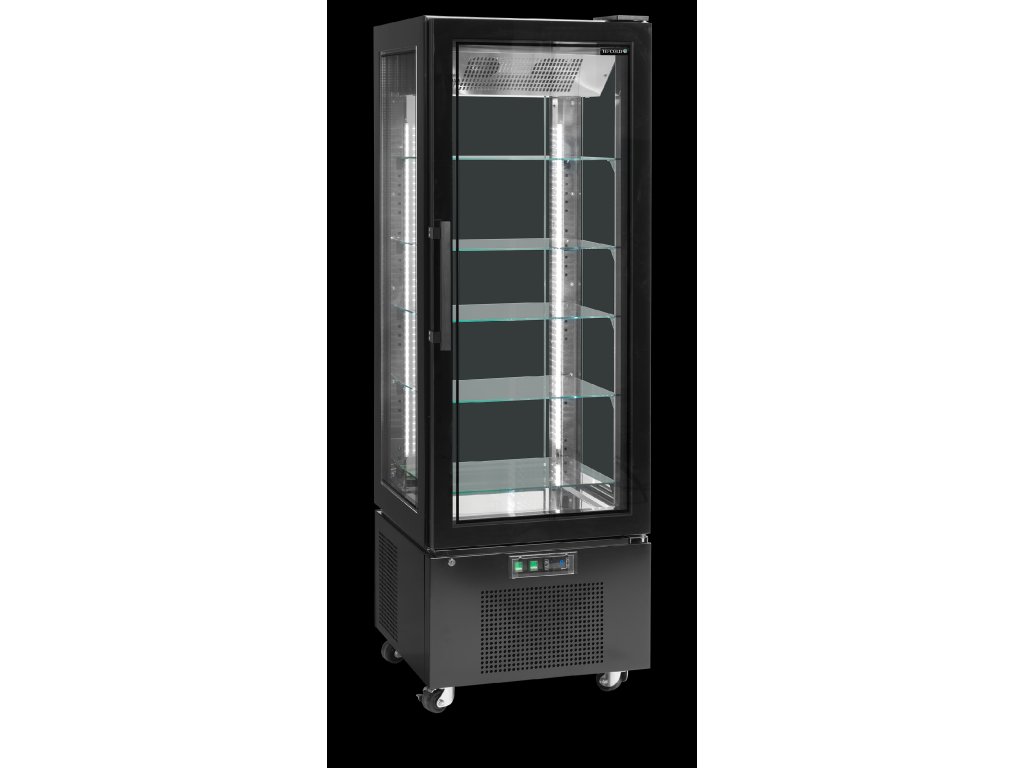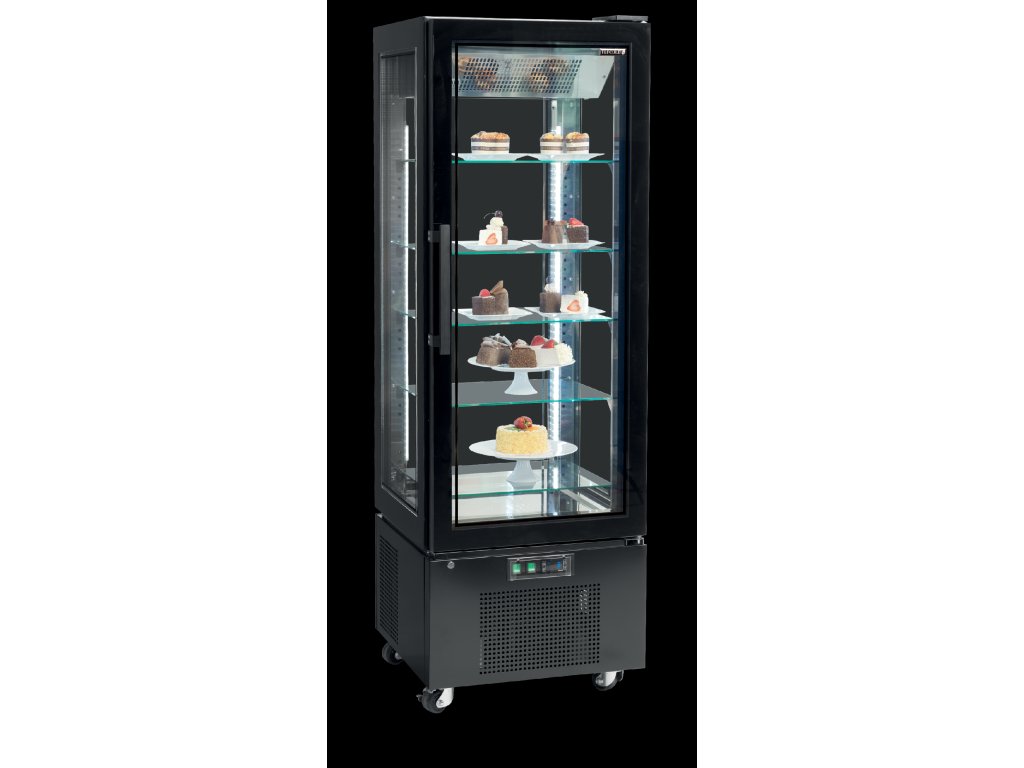 Prosklená vitrína UPD 400 C Black nabízí elegantní řešení pro vystavení dortů a zákusků. Chladicí vitrína má dvojité izolační sklo po všech stranách a to včetně prosklených dveří. Moderní design s vnějším povrchem z černé oceli, vnitřní prostor z nerezové oceli, pět výškově nastavitelných skleněch polic dělá spolu s LED osvětlením tuto panoramatickou vitrínu vskutku oblíbenou a elegantní.Doplňkové parametry