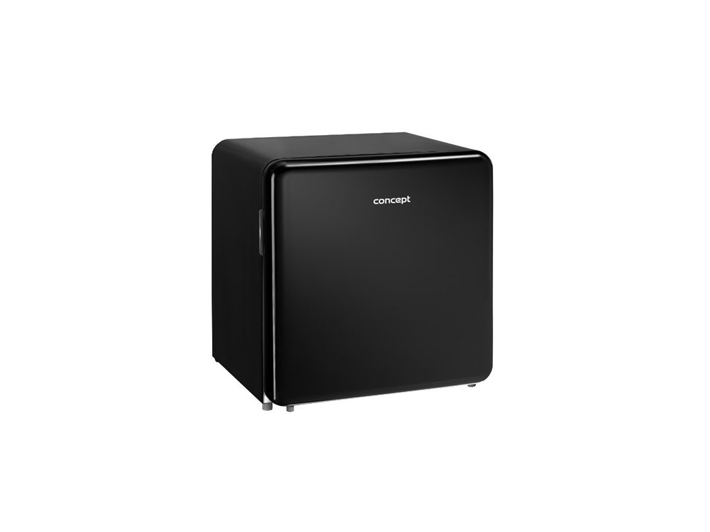 Malá lednice bez mrazáku, energetická třída F, klimatická třída N, ST a T, objem ledničky 46l, panty vpravo, počet polic lednice 2, počet přihrádek mrazáku 2, černá barva, funkce: antibakteriální těsnění, statické chlazení, 50×48.5×44 cm (V׊×H)Doplňkové parametry