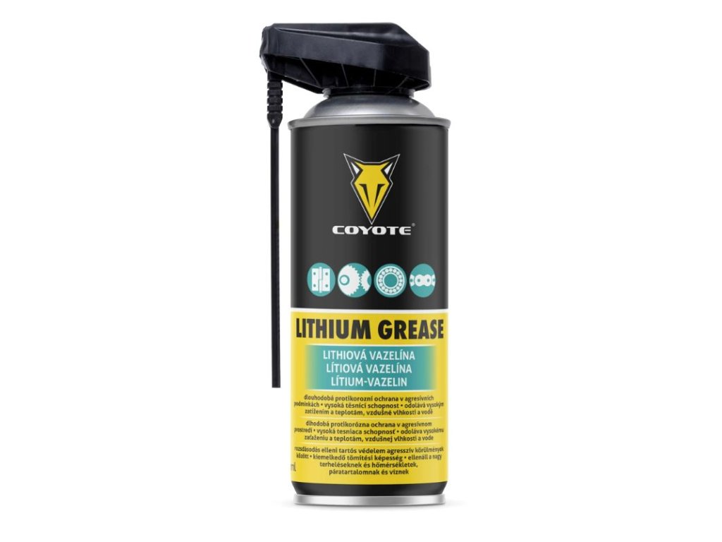 (BAL:1/12/840ks) Coyote Lithiová vazelína 400ml. S integrovaným aplikačním systémem.Objem: 400ml.Provedení přípravku: sprej-vazelína.Součástí: Integrovaný aplikátor pro plošnou nebo bodovou aplikaci.Lithiová vazelína je víceúčelová minerální mazací vazelína zahuštěná lithiovým mýdlem a obsahující přísady poskytující odolnost proti extrémním tlakům. Je vhodná pro všechny typy ložisek a mechanismů pracujících při vysokých zatíženích a teplotách. Velmi dobře odolává vysokým zatížením, vodě a vzdušné vlhkosti. Poskytuje velmi dobrou úroveň protikorozní ochrany v prostředích s velmi agresivními podmínkami. Zajišťuje dlouho trvající mazání. Po aplikaci nestéká. Omezuje tření zvláště při použití kov na kov.Doplňkové parametry