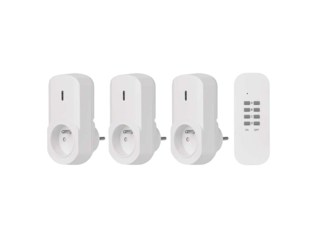 barva: bílá|dálkový ovladač: napájení 1× CR2032 3 V (součástí balení)|dětské clonky: ano|dosah signálu: až 25 m ve volném prostoru|easy learning: manuální přiřazení zásuvek k ovladači|krytí: IP20|materiál: plast|max. zátěž: 1 000 W|možnost ovládání: až 4 zásuvky|napětí/proud: 230 V~/4,35 A max.|počet pólů: 2P + PE|počet zásuvek: 1× 2P + PE|pozice ochranného kontaktu: neuvádí se|přenosoná frekvence: 433,92 MHz|prodejní obal: 1 ks, krabička|produkt: dálkově ovládané zásuvky, 3 zásuvky + 1× dálkový ovladač|typ: FRENCH|venkovní použití: ne|vypínač: neDoplňkové parametry