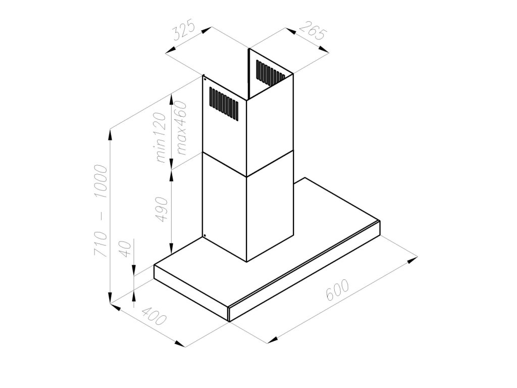 Elegantní komínový odsavač par ve tvaru T, se skleněným černým panelem Elektronický ovládací panel s dotykovým ovládáním funkce časovač 1 motor 4 rychlosti LED osvětlení - 2x 4W energetická třída B modré LED podsvícení display 2x kovový filtr proti mastnotám umývatelný v myčce s neomezenou životností (aluminium) max. výkon 334 m3/hod TURBO výkon 481 m3/hod nízká hlučnost 41 - 57 dBA TURBO max. hlučnost 63 dBA nastavitelná výška výstup 150 mm provedení nerez a černý skleněný panel odtah nebo možné používat jako recirkulační přes uhl. filtr (kód FW-K240) - není součástí digestoře max. příkon 170 W rozměry VxHxŠ: nastavitelná výška 71 - 100 x 40 x 60 cmDoplňkové parametry