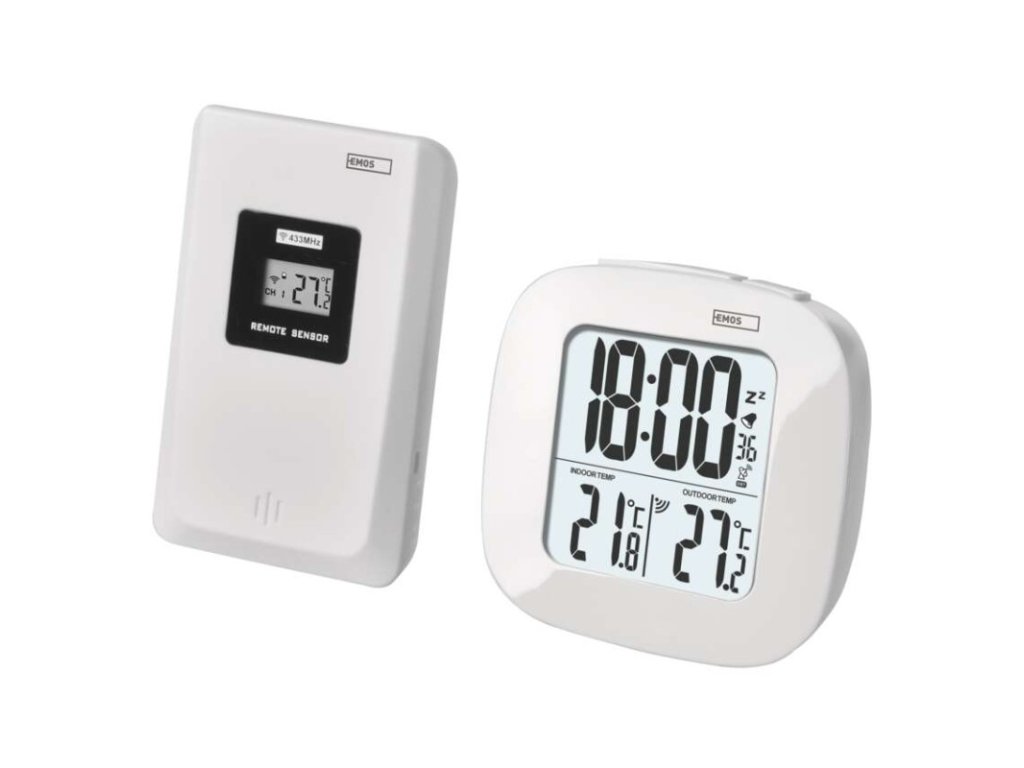 12/24 formát času: ano|barevný displej (black mask) podsvícený: ne|budík: ano|časová pásma: ano|datum: ano|dosah ve volném prostoru: až 30 m|drátová sonda k čidlu: ne|funkce stopky: ne|hodiny: řízené DCF signálem|kalendář: ne|LED podsvícení displeje: ano|magnet na připevnění: ne|min. a max. teplota: ano|možné další čidlo: 1 (E05018)|možnost nastavení jednotky teploty: °C/°F|možnost pověšení na zeď: ne|napájení čidla: 2× 1,5 V AAA (nejsou součástí balení)|napájení stanice: 2× 1,5 V AAA (nejsou součástí balení)|odpočet času max. od: ne|opakované buzení: ano|paměť poslední hodnoty: ne|přenosová frekvence: 433 MHz|prodejní obal: 1 ks, krabička|provedení teploměru: bezdrátový|rozměr čidla: 25 × 60 × 95 mm|rozměr hlavní jednotky: 30 × 78 × 78 mm|síťový adaptér: ne|teplotní index: ne|teplotní výstraha: ne|trend teploty: ne|trend tlaku: ne|trvalé podsvícení: ne|velikost displeje: 46 × 49 mm|venkovní teplota: -20 °C až +60 °C, rozlišení 0,1 °C|venkovní vlhkost: ne|vnitřní teplota: 0 °C až +50 °C, rozlišení 0,1 °C|vnitřní vlhkost: neDoplňkové parametry