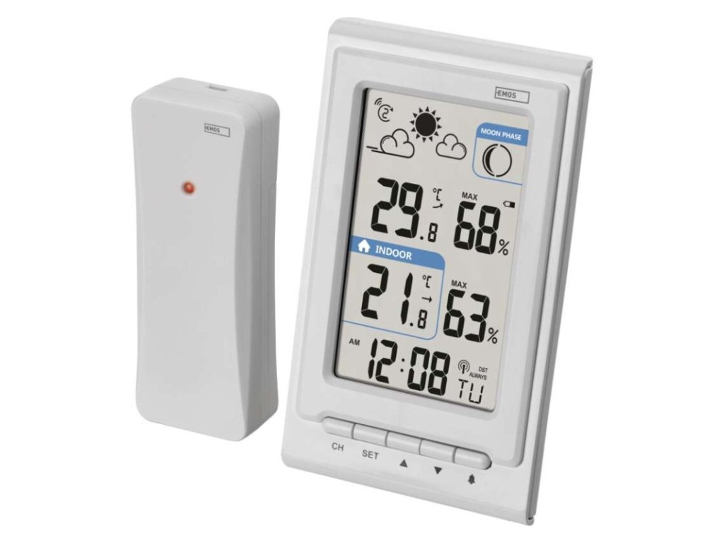 12/24 formát času: ano|anemometr: ne|barevný displej (black mask) podsvícený: ne|barometr: ne|budík: ano|časová pásma: ano|další funkce: –|datum: ano|dosah čidla: až 30 m|drátová sonda k čidlu: ne|elektronické plošné podsvícení: ne|fáze měsíce: ano|hodiny: řízené DCF signálem|kalendář: ano|kompatibilita: –|korekce nadmořské výšky: ne|LED podsvícení displeje: ne|min. a max. teplota: ano|možné další čidlo: až 3 čidla (E05018, E00387)|možnost nastavení jednotky teploty: °C/°F|možnost pověšení na zeď: ano|napájení čidla: 2× 1,5 V AA (nejsou součástí balení)|napájení stanice: 2× 1,5 V AAA (nejsou součástí balení)|notifikace do mobilní aplikace: –|opakované buzení: ano|ovládání hlasovými asistenty: –|podporované OS: –|předpověď počasí: ano|přenosová frekvence: 433 MHz|prodejní obal: 1 ks, krabička|produkt: meteostanice|projekce: ne|protokol: –|provedení: bezdrátové|rozměr čidla: 21 × 38 × 100 mm|rozměr hlavní jednotky: 23 × 76 × 126 mm|síťový adaptér: ne|srážkoměr: ne|teplotní výstraha: ne|trend teploty: ano|trend tlaku: ne|trvalé podsvícení: ne|velikost displeje: 50 × 81 mm|venkovní teplota: -40 °C až +60 °C, rozlišení 0,1 °C|venkovní vlhkost: 20 % až 95 % RV, rozlišení 1 %|vnitřní teplota: -10 °C až +50 °C, rozlišení 0,1 °C|vnitřní vlhkost: 1 % až 99 % RV, rozlišení 1 %Doplňkové parametry