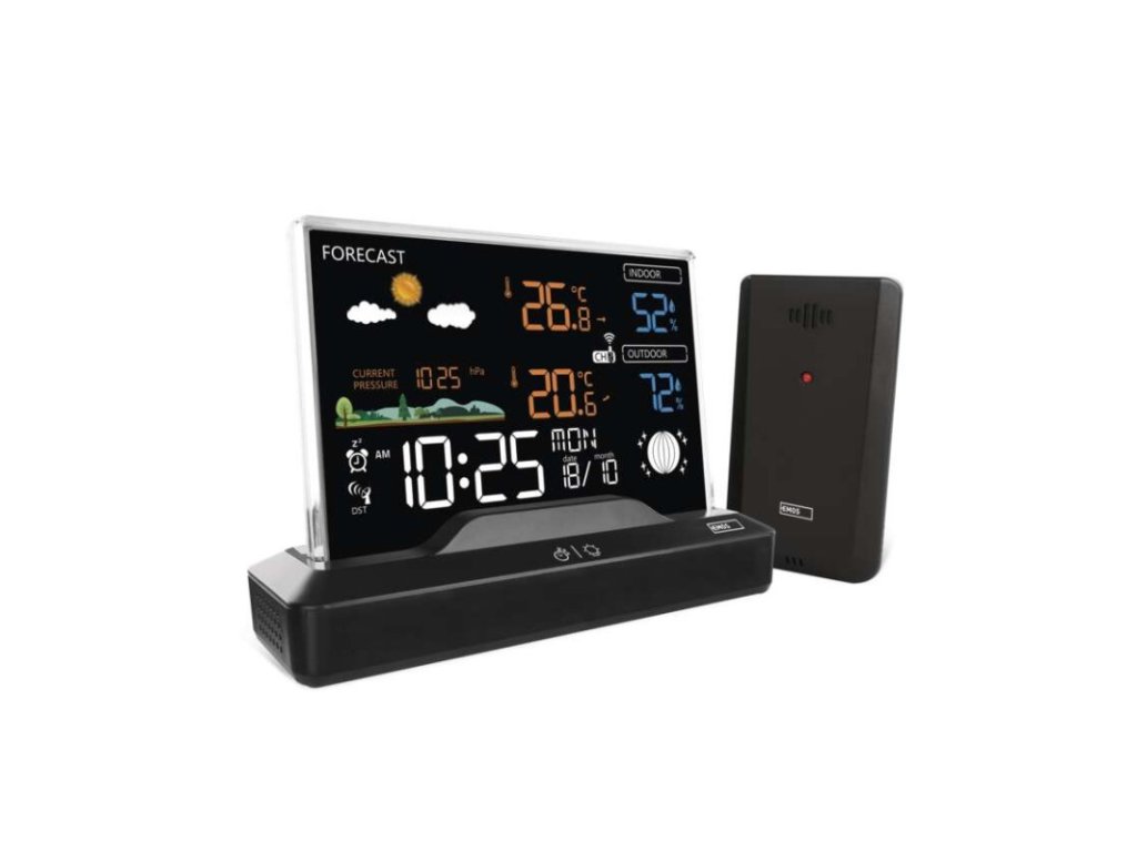 12/24 formát času: ano|anemometr: ne|barevný displej (black mask) podsvícený: ano|barometr: ano|budík: ano|časová pásma: ano|další funkce: -|datum: ano|dosah čidla: až 80 m|drátová sonda k čidlu: ne|elektronické plošné podsvícení: ano|fáze měsíce: ano|hodiny: řízené DCF signálem|kalendář: ano|kompatibilita: -|korekce nadmořské výšky: ne|LED podsvícení displeje: ano|min. a max. teplota: ano|možné další čidlo: až 3 čidla (E00387, E05018)|možnost nastavení jednotky teploty: °C/°F|možnost pověšení na zeď: ne|napájení čidla: 2× 1,5 V AAA (nejsou součástí balení)|napájení stanice: 2× 1,5 V AAA (nejsou součástí balení)|notifikace do mobilní aplikace: -|opakované buzení: ano|ovládání hlasovými asistenty: -|podporované OS: -|předpověď počasí: ano|přenosová frekvence: 433 MHz|prodejní obal: 1 ks, krabička|produkt: meteostanice|projekce: ne|protokol: -|provedení: bezdrátové|rozměr čidla: 50 × 25 × 95 mm|rozměr hlavní jednotky: 155 × 50 × 113 mm|síťový adaptér: ano, 5 V DC/1 000 mA (součástí balení)|srážkoměr: ne|teplotní výstraha: ne|trend teploty: ano|trend tlaku: ne|trvalé podsvícení: ano|velikost displeje: 127 × 85 mm|venkovní teplota: -40 °C až +70 °C, rozlišení 0,1 °C|venkovní vlhkost: 20 % až 99 % RV, rozlišení 1 %|vnitřní teplota: 0 °C až +50 °C, rozlišení 0,1 °C|vnitřní vlhkost: 20 % až 99 % RV, rozlišení 1 %Doplňkové parametry