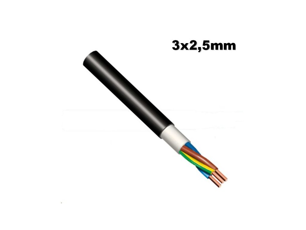 Cena za 1m - prodej pouze po 100mVhodný pro rozvod zásuvekPro pevné uložení ve vnitřních a venkovních prostorách, v zemi, v betonu.Technické parametry:počet žil: 3průřez žil: 2,5 mm2barva žil: hnědá/modrá/zelenožlutábarva izolace: černáDoplňkové parametry