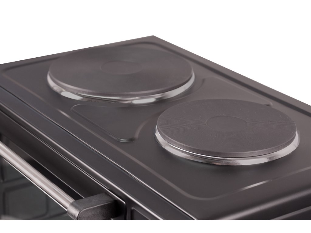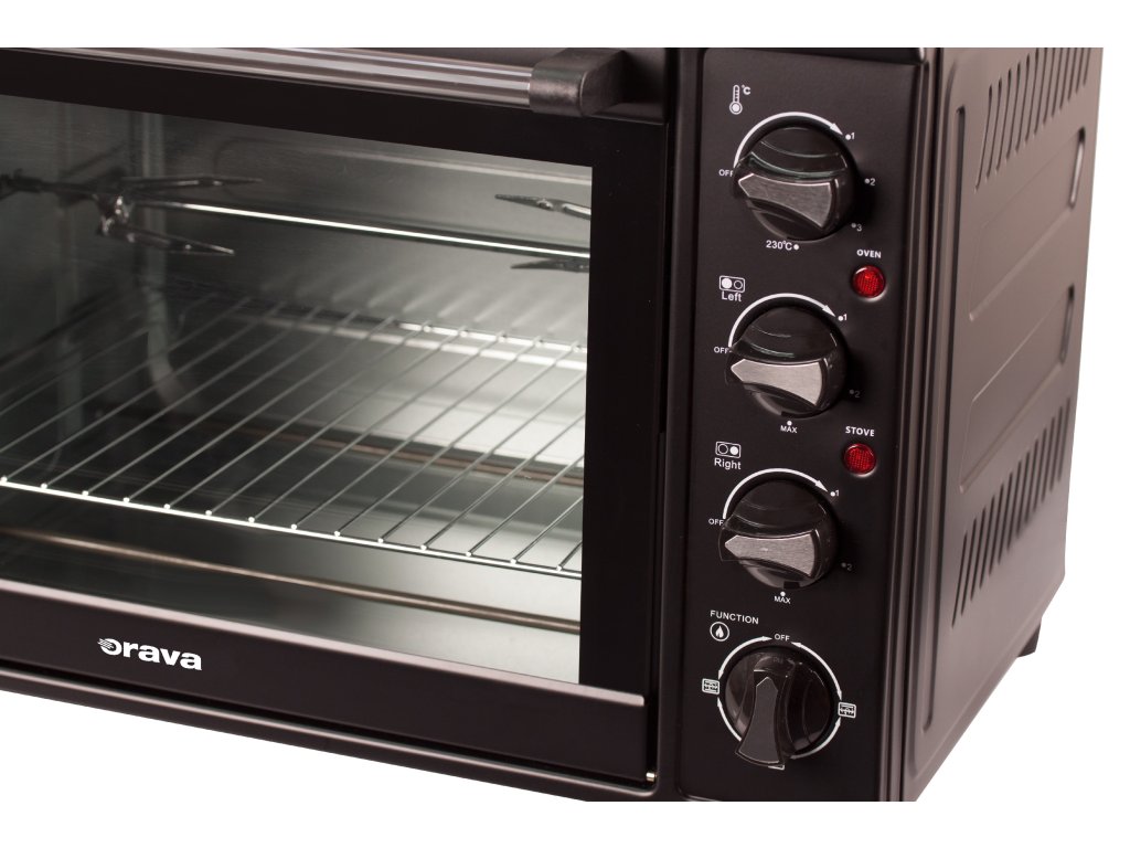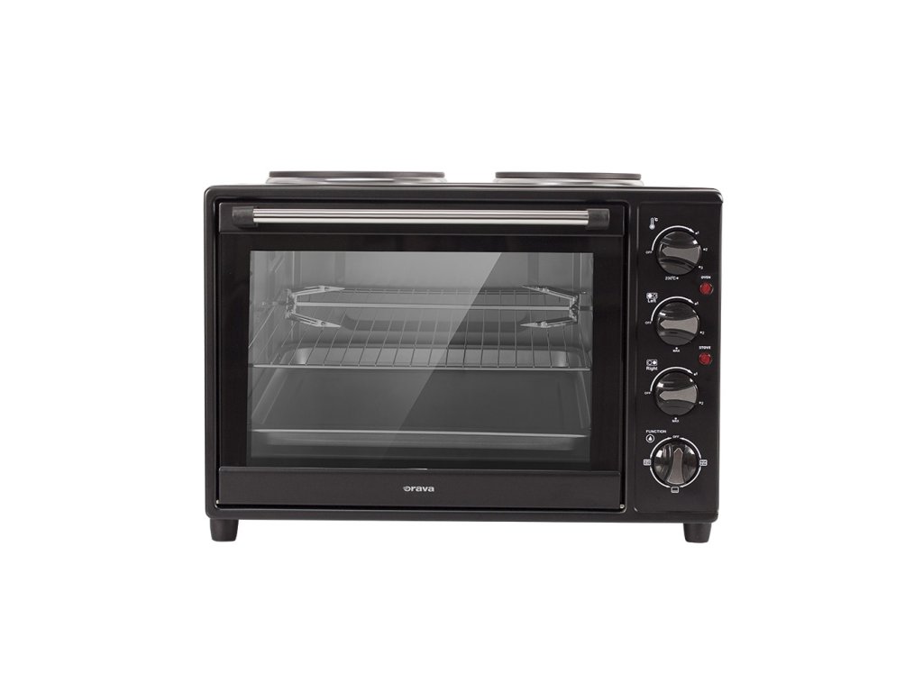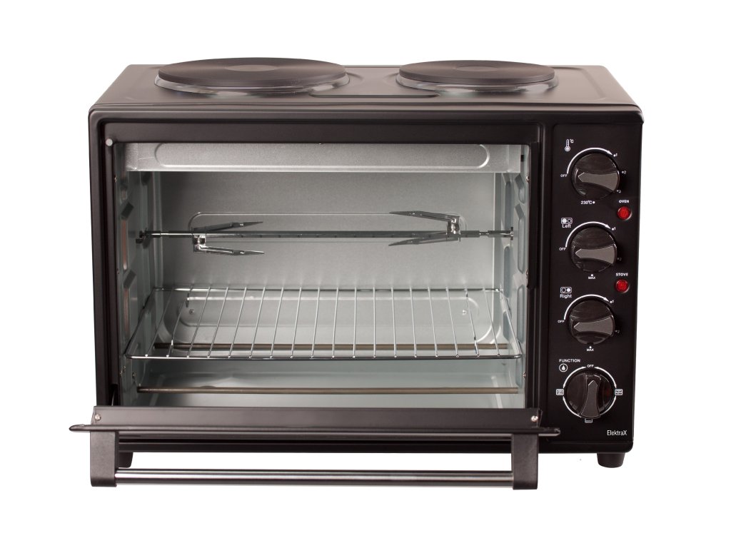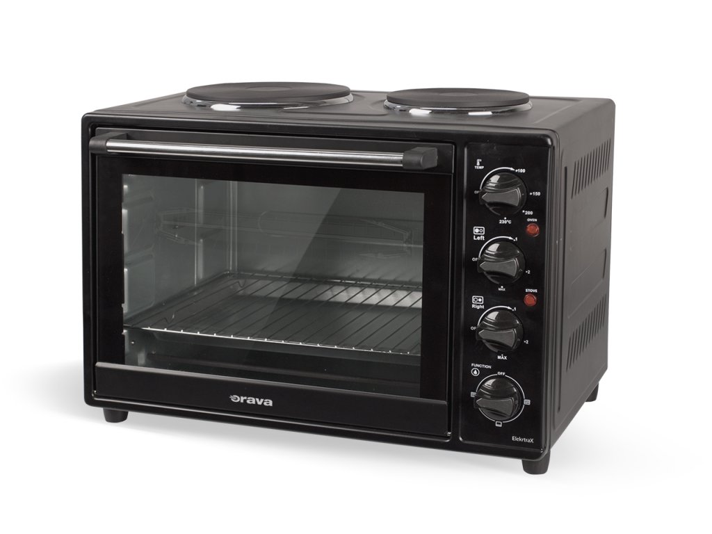 Elektrická trouba se dvěma plotnami Vnitřní objem trouby 34 l Funkce trouby a vařiče současně Grilovací rošt a odkapávací plech součástí příslušenství Příkon trouby 2 000 W Litinové plotny o průměru 155 mm (600 W) a 185 mm (1 000 W) Samostatná regulace jednotlivých ploten Plynulé nastavení teploty pečení od 100 ° C až do 230 ° C elektrický termostat Příkon max. 3 600 W Napájení: 230V ~ 50Hz