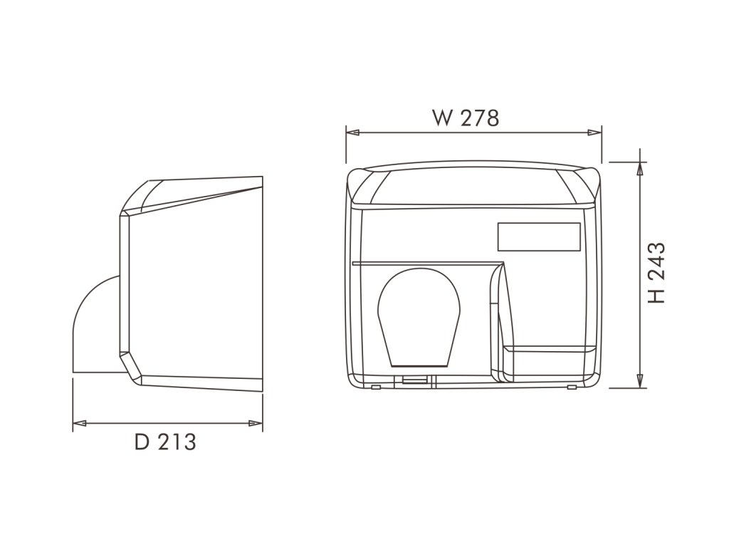 Bezkontaktní osoušeč: 230 V / 50 Hz, příkon 2.400 W / 10,4 A, IPX1, CLASS1, CE - Motor: příkon 200 W, 5.500 ot./min, s uhlíkovými kartáči - Topné těleso: příkon 2.200 W, termostat 65° C - Průtok vzduchu: 345 m3/h - Rychlost proudění vzduchu: 101 km/h - Úroveň hluku: 70 dB(A) v tolerančním pásmu +3 dB - Nastavitelná vzdálenost sepnutí senzoru: 10 – 30 cm - Průměrná doba vypnutí po oddálení rukou: 20 – 25 s - Bezpečnostní časový interval: 120 s (automatické vypnutí při nepřetržité aktivaci senzoru) - Výdechová tryska: otočná o 360°, pochromovaná zinková slitina - Kryt: ocel bíle lakovaná, tloušťka 2 mm - Ochrana krytu: 2 zámky, antivandal provedení - Hmotnost: 7 kg netto / 7,5 kg brutto - Rozměry: 278 mm × 243 mm × 213 mm (š × v × h)