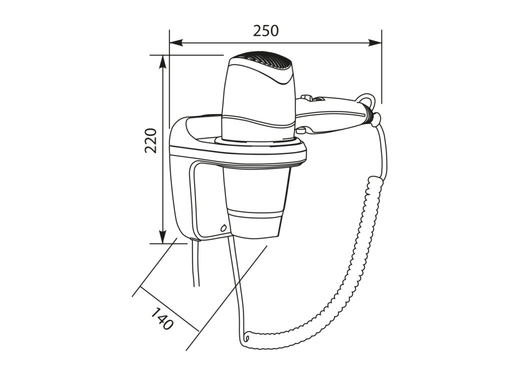 Hotelový fén s montáží na zeď, 3 rychlosti, 220 V - 240 V / 50 - 60 Hz, příkon 1.800 W, přepínač rychlostí a spouštěcí tlačítko na rukojeti, hlavní vypínač na stojánku, materiál ABS, bezpečnost CLASS II, dvojitá izolace, rozměry 220 mm výška × 250 mm šířka × 140 mm hloubka, hmotnost 0,82 kg