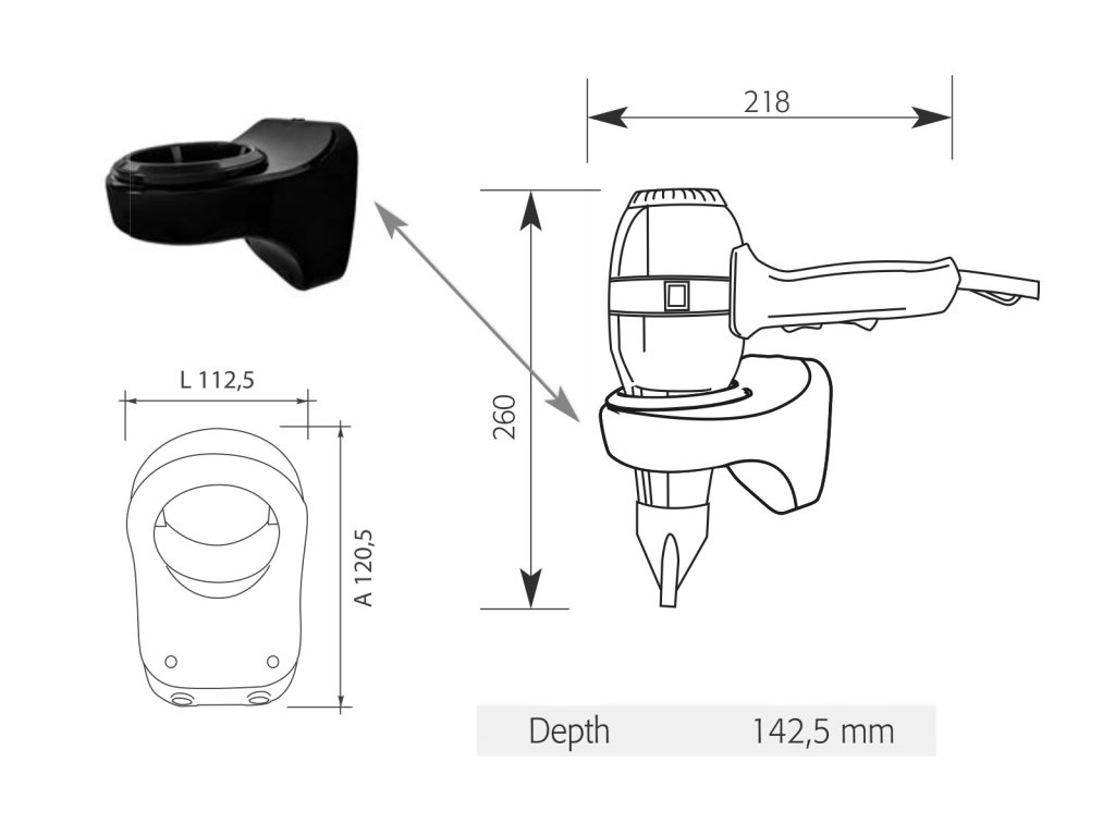 Hotelový fén s montáží na zeď, 2 rychlosti, 220 V - 240 V / 50 - 60 Hz, 1.300 W, přepínač rychlostí a topného výkonu na rukojeti, hlavní vypínač na stojánku, materiál ABS + nerez, bezpečnost CLASS II, dvojitá izolace, rozměry 260 mm výška × 218 mm šířka × 102,5 mm hloubka, hmotnost 0,8 kg