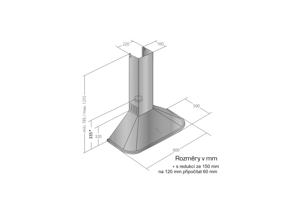 Komínová digestoř ke zdi, šíře 60 cm, nerez, max. výkon 822 m³/h (5 Pa), hlučnost Lw 51 – 69 dB(A), 3 rychlosti + TURBO, odsávací jednotky mají individuálně vyvažovanou turbínu, motory jsou opatřené vratnými tepelnými pojistkami (při přetížení motoru vypne, po jeho vychladnutí opět sepne), kovové sendvičové tukové filtry, které lze mýt v myčce, výstupní průměr 150 mm, možnost práce v odtahovém i recirkulačním režimu, VIP výbava: úsporné LED osvětlení 2 × 2 W, elektronické dotykové ovládání s doběhovým časovačem, zdarma dálkový ovladač i s bateriemi, zdarma redukce na 120 mm a zpětná klapka, Benefity: používání dálkového ovládání usnadňuje údržbu digestoře (méně otisků na digestoři = snazší čištění), ovladač je opatřený magnetem, lze jej přichytit třeba na dveře lednice (může být snadno po ruce, nikam nezapadne)