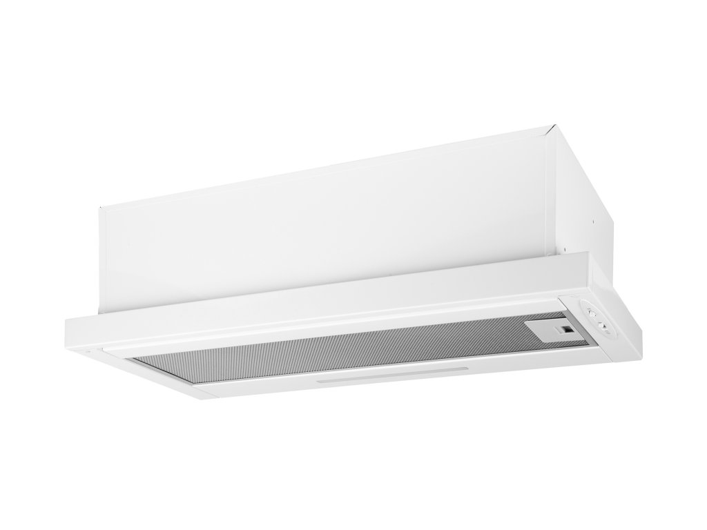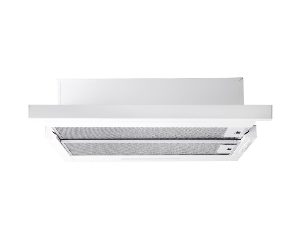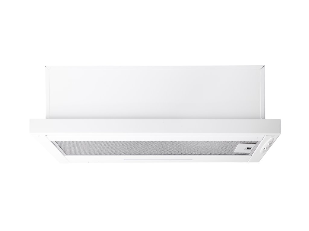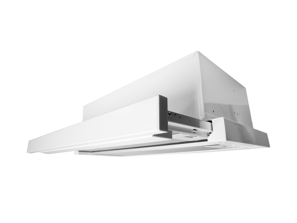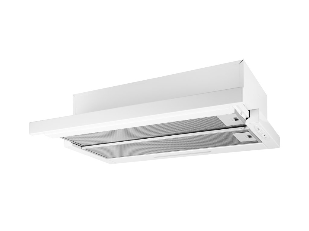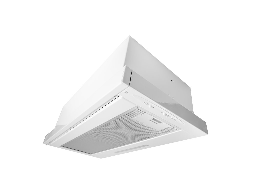 Vestavná digestoř výsuvná, jediná na trhu s odtahem dozadu nebo nahoru (oba 120 mm), šíře 60 cm, bílá, max. výkon 338 m³/h (15 Pa), hlučnost Lw 56 – 71 dB(A), 3 rychlosti, odsávací jednotky mají individuálně vyvažovanou turbínu, motory jsou opatřené vratnými tepelnými pojistkami (při přetížení motoru vypne, po jeho vychladnutí opět sepne), mechanické posuvné ovládání, kovové sendvičové tukové filtry, které lze mýt v myčce, možnost práce v odtahovém i recirkulačním režimu, Výbava: úsporné LED osvětlení 1 × 2,8 W (LED pásek), zdarma zpětná klapka Recirkulační režim u vestavných digestoří: Digestoř se osadí uhlíkovým pachovým filtrem. Přefiltrovaný vzduch se z digestoře odvádí obdobně jako u odtahového režimu trubkou, která prochází celou skříňkou. Tato trubka však neústí kolenem do zdi, ale nad skříňku, kde ji doporučujeme zakončit mřížkou. Pro výrobu skříňky je směrodatný rozměrový nákres a údaje v něm uvedené. Fotografie digestoří jsou ilustrační.Doplňkové parametry