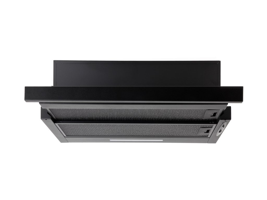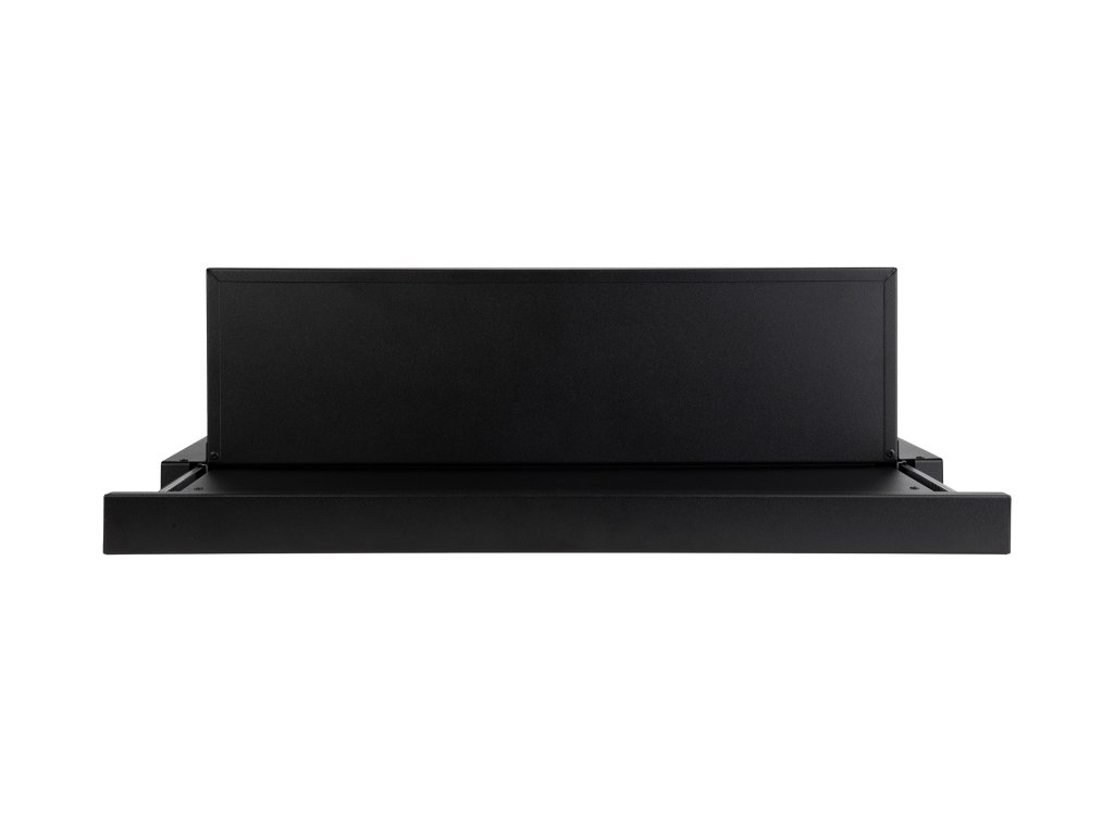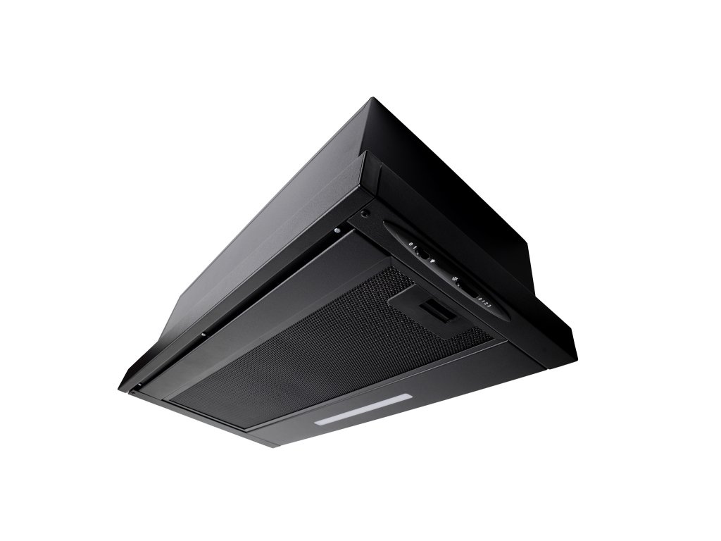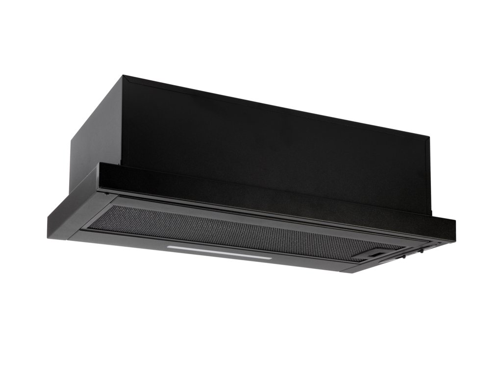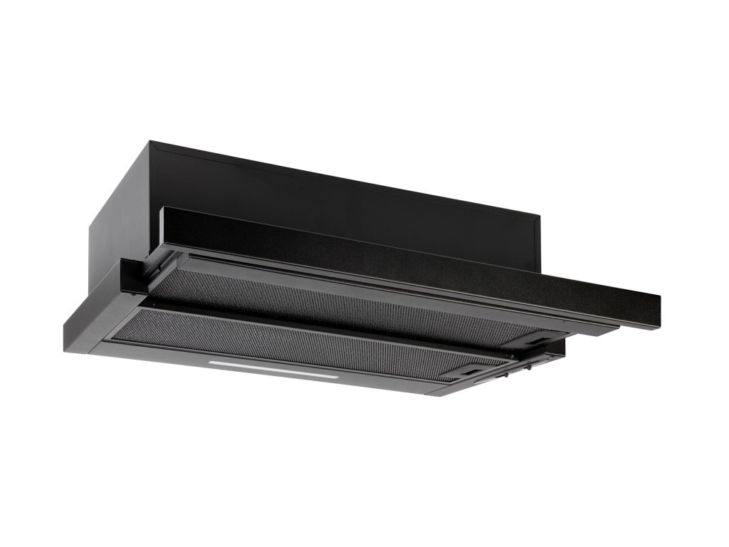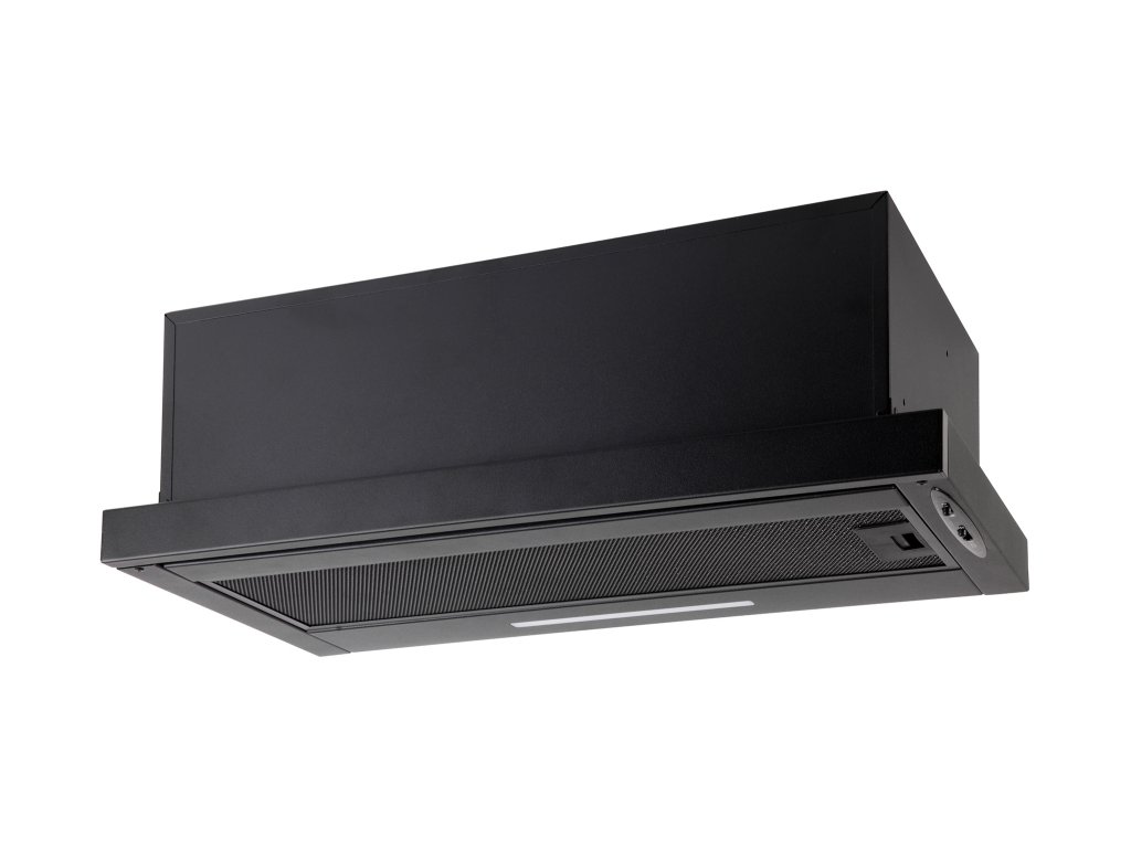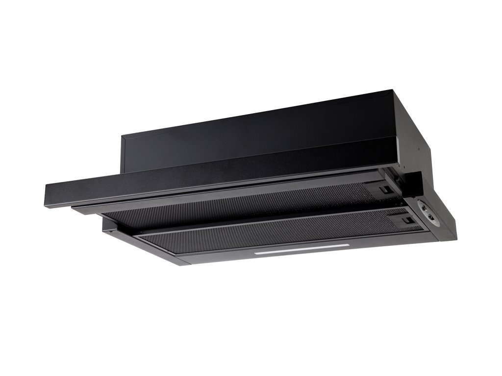 Vestavná digestoř výsuvná, jediná na trhu s odtahem dozadu nebo nahoru (oba 120 mm), šíře 60 cm, černá, max. výkon 338 m³/h (15 Pa), hlučnost Lw 56 – 71 dB(A), 3 rychlosti, odsávací jednotky mají individuálně vyvažovanou turbínu, motory jsou opatřené vratnými tepelnými pojistkami (při přetížení motoru vypne, po jeho vychladnutí opět sepne), mechanické posuvné ovládání, kovové sendvičové tukové filtry, které lze mýt v myčce, možnost práce v odtahovém i recirkulačním režimu, Výbava: úsporné LED osvětlení 1 × 2,8 W (LED pásek), zdarma zpětná klapka Recirkulační režim u vestavných digestoří: Digestoř se osadí uhlíkovým pachovým filtrem. Přefiltrovaný vzduch se z digestoře odvádí obdobně jako u odtahového režimu trubkou, která prochází celou skříňkou. Tato trubka však neústí kolenem do zdi, ale nad skříňku, kde ji doporučujeme zakončit mřížkou. Pro výrobu skříňky je směrodatný rozměrový nákres a údaje v něm uvedené. Fotografie digestoří jsou ilustrační.Doplňkové parametry